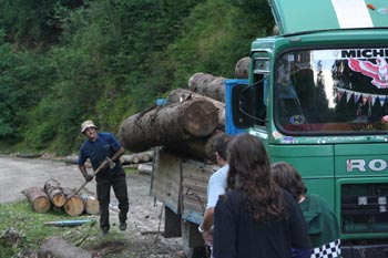 Ya cerca de del hotel nos encontramos con un camión que ocupa toda la pista y que nos impide el paso. Es un camión cargado de grandes troncos de árbol, que son descargados con muchísima habilidad por dos hombres que los tiran aparentemente sin ningún cuidado, pero que, una vez fuera del camión, quedan totalmente colocados en la cuneta del camino.