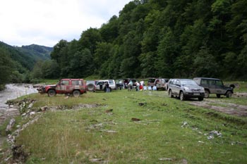 Cuando llegamos a la base de la montaña parece que la subida no tiene una gran dificultad, pero nos equivocamos pues por el camino que estaba previsto que subiéramos sólo suben Mircea, Federico, David y Paco, porque la pista según van pasando coches se va rompiendo más y se va haciendo más difícil la ascensión. Nosotros subimos por un camino alternativo que sale a la izquierda y conseguimos por allí llegar a la cima sin dificultad, pero a medida que también se va rompiendo esa pista la ascensión va teniendo más dificultad. Al final conseguimos subir todos y tenemos que cambiar la ruta prevista que nos iba a llevar por la montaña fuera de pista porque, ¡y como todos los días¡, comienza a llover, lo que supone un peligro porque hay que circular por hierba en pendiente que puede resultar muy resbaladiza.