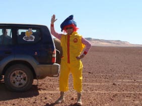 Ya empezamos a pasar calor, llanuras, alguna duna, ríos de arena, dromedarios y piedras quemadas por el sol. Mientras seguíamos entregando los regalos de los niños y niñas, Javi con su súper maquina no paraba de hacer fotos, pasamos por el interior de un cráter que al parecer hizo un antepasado mío caído del cielo, reagrupación para comer, intercambio de manjares, Imma de los nervios en lo alto de la pikat megáfono en mano (por favor, abrir squelt, subir el volumen de la emisora, contestar cuando os llamemos), algún control militar, incluso me pareció ver a Ronald Mcdnalds, pero seguro que era otro espejismo.